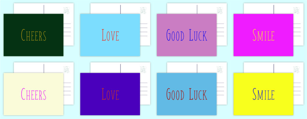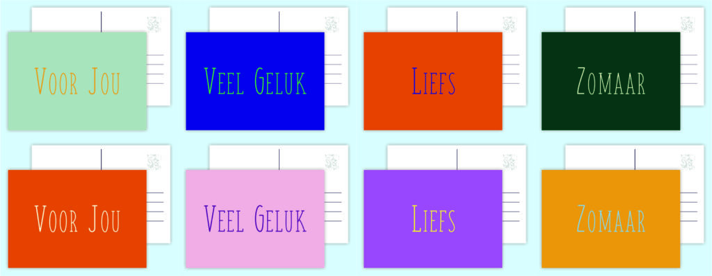 Kaarten sets van 8 verschillende enkele A6-kaart (148x105mm) gedrukt op stevig 260-grams papier. De achterkant is voorzien van een adreslijn en ruimte voor een persoonlijke boodschap.